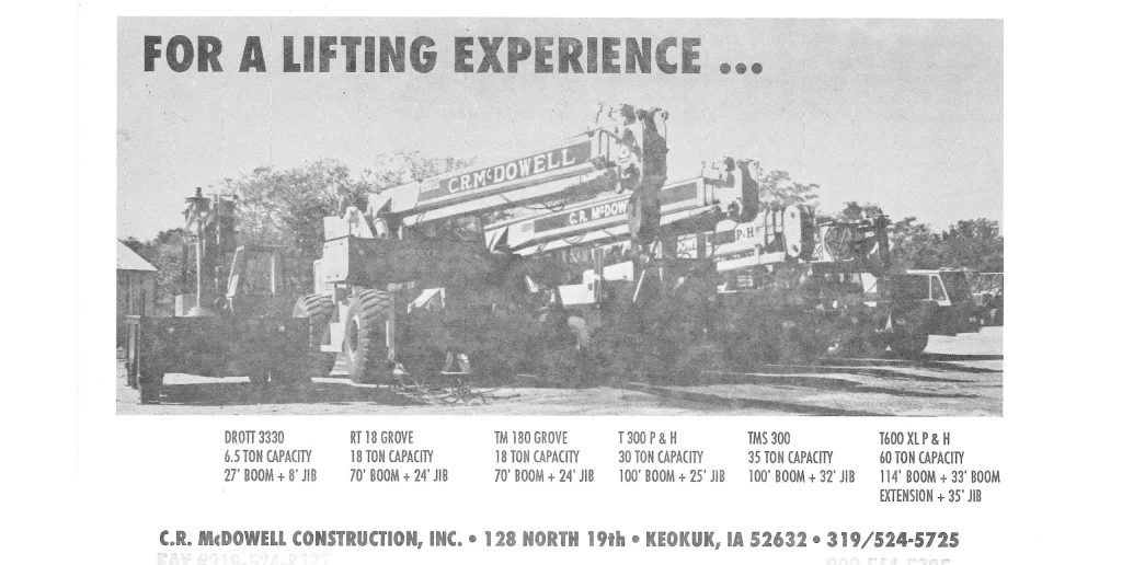 Headquartered out of Keokuk, Iowa, McDowell Crane & Rigging provides long-term and short-term crane rentals throughout the Tri-State area of Iowa, Illinois and Missouri. The company traces its roots back to 1950 when Charles Robert (C. R.) McDowell started a construction company in Keokuk. C.R. built houses and he bought an old crane to help with that. In 1970, he bought his first hydraulic crane, an 18-ton, which was considered big at the time.